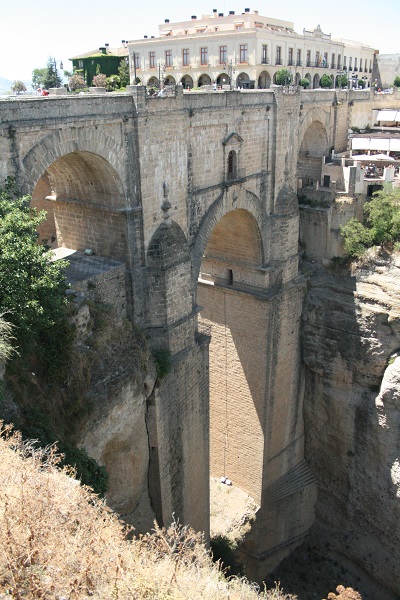 Ronda är en av Spaniens äldsta städer. Den ligger 750 meter över havet på en platå, som delas mitt itu av ravinen el Tajo, där floden Guadalevín rinner. Staden har 3 st broar över ravinen. Den ursprungliga bron, Puente Romano (eller Puente Árabe eller Puente de San Miguel, som den också kallas) har utsikt över de romerska baden som byggdes på 1100- och 1200-talen och är Spaniens bäst bevarade arabiska hammam (vattenbad). Puente Viejo byggdes 1616 och Puente Nuevo byggdes 1751-1793. Puente Nuevo, som går 120 meter över ravinens botten, är den högsta av broarna.